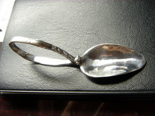ベビースプーン第一弾 実にシンプル♪ イニシャル、柄の部分に模様 アクセントと匙と柄の補強を兼ね、 銀粒を「小」「大」「小」と、三つ置いてあります♪ あとは誕生石のアクアマリンをタガネ止め んと、本当はね、イニシャルにちなんで 全体の形をリンゴ型に見立てて、葉がついていたのですが ・・馬鹿力で折りました・・ 安全を考えるとなくてよかったかも(^^; 第二段、第三弾も作成中〜