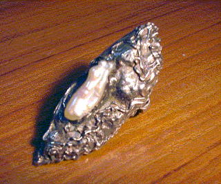NO.2 「ナメクジクン頑張れリング はっきり言って、凶器に近いです(笑 一関節と手の甲をを少々包みます。。。 作成法としては、シリンジで遊んでます〜^^; 「中子」には、ティッシュ使用。 上の淡水パ-ルの部分は へこませて作成し、 エポキシ樹脂で貼り付けてあります。 ぐにゃぐにゃっとゴシック調(のつもり・・笑 「ナメクジ君」は、友人が命名。 さぁ、ナメクジ君、 頑張って岩場を抜け出すんだ!!