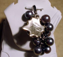 NO.2 巨峰ちゃん♪ 黒真珠に銀粘土で葉っぱをつけただけ〜^^; 銀線でぐるぐるっと、蔓をつけようかな? あった方が可愛いよね? |