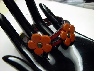お花ブレス 二重巻き☆ 体験で作成♪ 全部させて頂きました♪ ・・(お花に切り取るの以外・・これは作成してあったのを使用) すごく面白かった♪ とっても簡単バージョンですが、お気に入り^^v 左画像から 見ていただけると、 判りますが、 マグネットの金具使用。 そして、金具の両端に革 を通して、カシメで留めてあります〜♪ uyouni